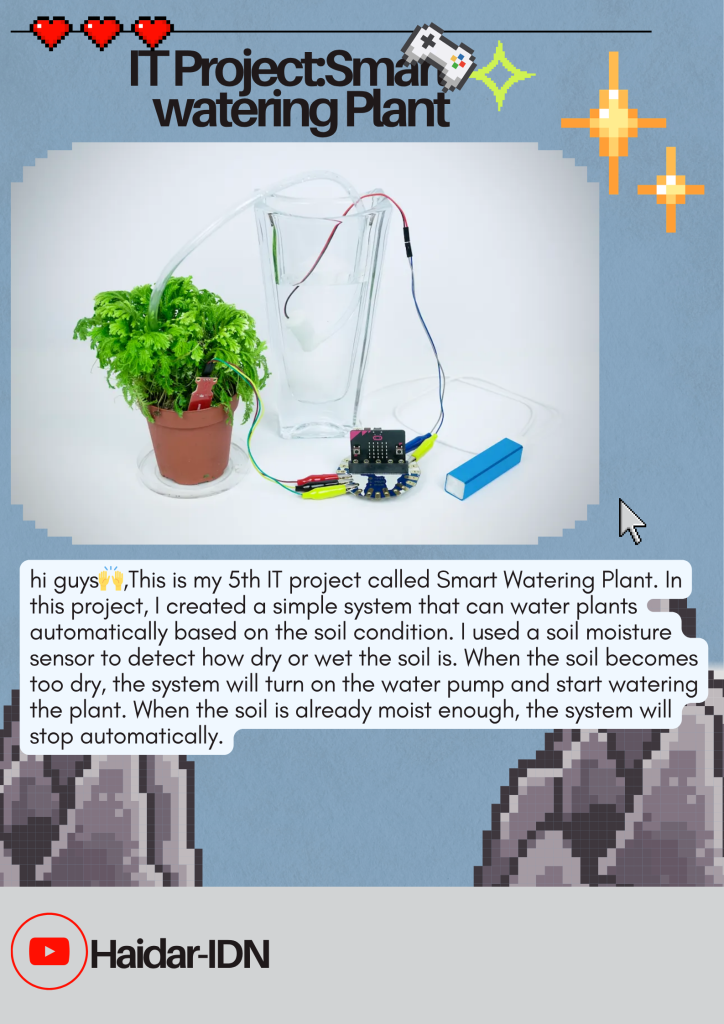 hi guys🙌,This is my 5th IT project called Smart Watering Plant. In this project, I created a simple system that can water plants automatically based on the soil condition. I used a soil moisture sensor to detect how dry or wet the soil is. When the soil becomes too dry, the system will turn on the water pump and start watering the plant. When the soil is already moist enough, the system will stop automatically.